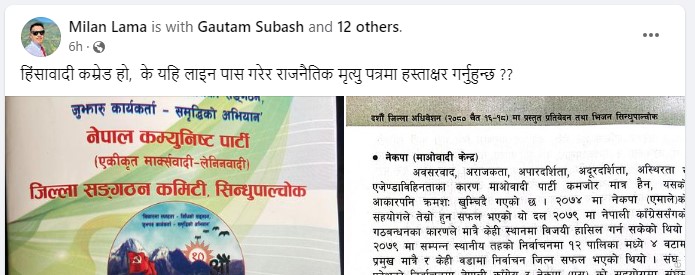 ‘कमरेड कमल नेपाल र सिन्धु एमाले, शब्दकोष नै रित्तिने गरी अरुलाई गाली गर्दा तपाईंका कार्यकताको ताली ठोके होलान् । तपाईंको आत्मामा एकैछिन न्यानो मिल्यो होला’, काफ्लेले सामाजिक सञ्जालमार्फत भनेका छन्– ‘हिम्मत छ, सम्मेलन स्थगित गरेर टुडिखेल आउनोस् ! मुलुकको समग्र परिवर्तनमा राजनीतिक दलहरुको त्याग, तपस्या, बलिदानी र भुमिकाको बहस गरौ !’