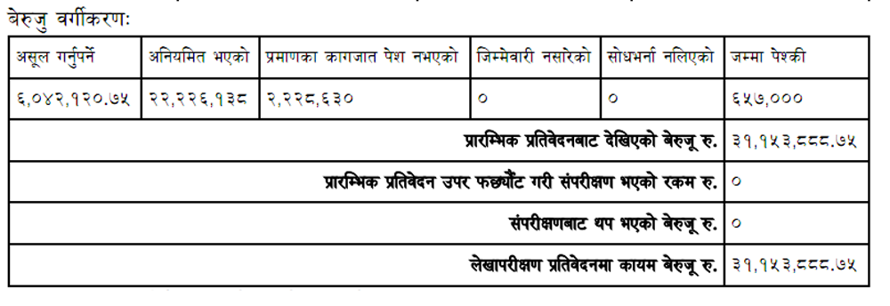 प्रतिवेदन अनुसार बाह्रबिसे नगरपालिकाको बेरुजु ३ करोड ११ लाख ५३ हजार ८ सय ८८ रुपैंया ८५ पैशा रहेको देखिन्छ ।